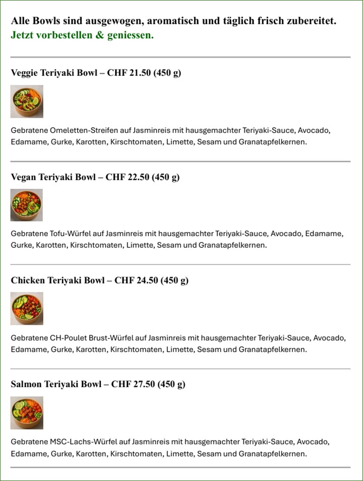 Damit wir Ihnen unsere Bowls stets frisch, hochwertig und mit grösster Sorgfalt zubereiten können, bitten wir um Ihre Bestellung bis spätestens 12.00 Uhr am Vortag.